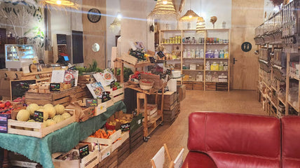 C'est pour cela qu'Anne a créé un coin salon de thé dans son épicerie. Dans l'épicerie, on retrouve principalement des produits locaux, environ 200 km autour de la boutique, de saison, et 98 % bio. Si certains produits ne sont pas bio, c'est parce qu'ils s'inscrivent tout de même dans une démarche intéressante. Par exemple, chez L'éco pin, on trouve des produits de Sains et Saufs, qui valorisent les fruits et légumes invendus, déclassés ou en surproduction des producteurs de la région.